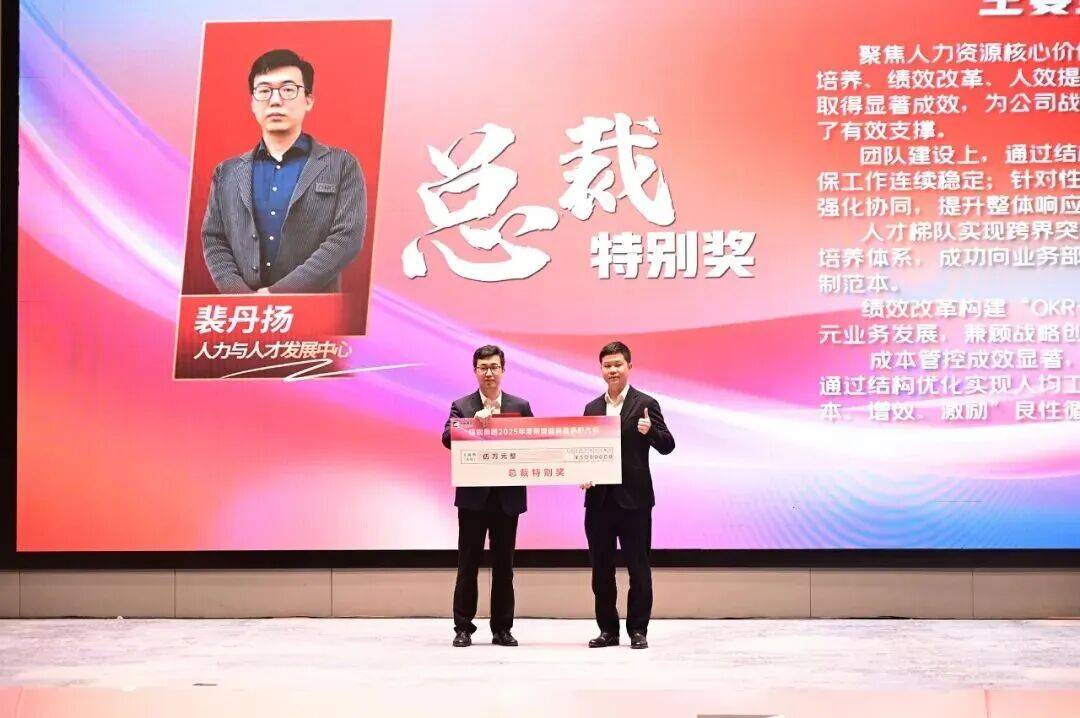 总裁特别奖:人力与人才发展中心裴丹扬,全面主导并推动了人力资源体系革新项目,具体包括跨界人才梯队搭建、双驱绩效模式构建及薪酬结构优化等关键子项目。