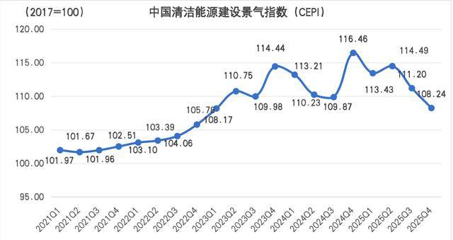 数据显示,2025年第四季度中国清洁能源建设景气指数(CEPI)为108.242,同比下降8.22点,环比下降2.96点,仍处于100-120的较景气区间内。据悉,CEPI以2017年为基期,聚焦水电、核电、风电和太阳能发电四大领域,取值范围0-200,100为景气临界值,此次指数波动主要受清洁能源新增发电装机容量基期增速放缓影响。
