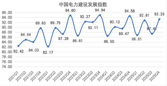 具体来看,四大分指数表现各有侧重。其中,经济效益分指数表现最佳,为92.93,同比上升3.53点,环比上升9.15点,尽管2025年第四季度电力建设行业营业收入2817.18亿元、新签合同总额4907.81亿元,同比均有小幅下降,但整体盈利水平和发展韧性持续增强;绿色发展分指数为93.19,同比下降4.81点,环比上升9.66点,第四季度非化石能源发电新增装机14208万千瓦,同比下降14.88%,环比增长231.50%,占全国新增发电装机容量的79.18%;产业规模分指数为95.50,同比下降0.93点,环比上升4.87点,电网侧新开工项目规模、新增输电线%,抵消了电源侧新开工项目同比下降的影响;宏观经济影响分指数为80.00,同比下降12.07点,环比微降0.05点,主要因第四季度电力建设投资完成额6958亿元,同比下降11.13%,其占全国固定资产投资(不含农户)的比重同比、环比均有上升。